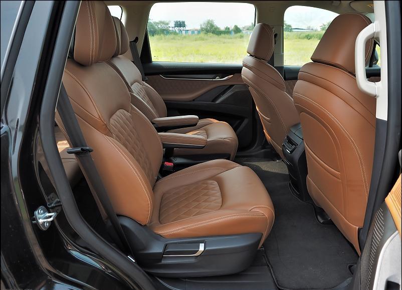 The Gloster is a very high SUV. So ingress & egress are very challenging, particularly for elder folks. Even with the side steps, it is a 2-step climb to get in. The Gloster is the only SUV in its segment that’s available with rear captain seats for the top 3 variants. You can get a bench seat in the Super (base) and Sharp (one below the top) variants. The seats are comfortable, but as with all ladder frame SUVs, they are low set and offer less under-thigh support. The seats slide back and forth, providing decent legroom. You also get a foldaway armrest for each seat. The headrests are like the business class seats of an airplane with adjustable side support which you pull towards yourself.