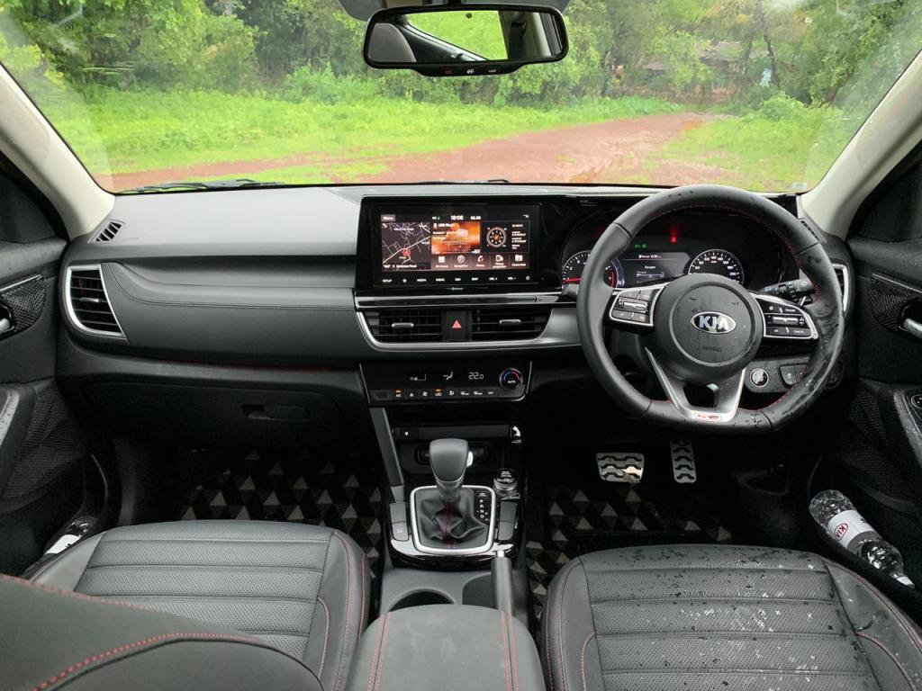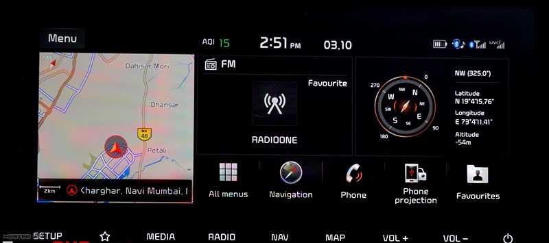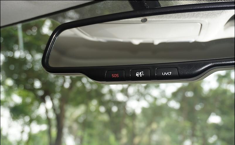 The Internal Rear View Mirror houses 3 buttons – SOS, Which makes a emergency call to the Kia Customer Care, Tow button, which makes a call to the Kia Roadside Assistance and the third button which will launch UVO (telematics). Also, the IRVM is equipped with auto dimming feature. The Infotainment system of the car gets 50+ connecting features including the Kia Voice Control that has been provided with the Kia Seltos with the 10.25 inch HD Touchscreen unit. With the Voice Control feature, the features of the car can be easily accessed by simply saying Hello Kia (Hello Kia, Roll down the driver’s window).